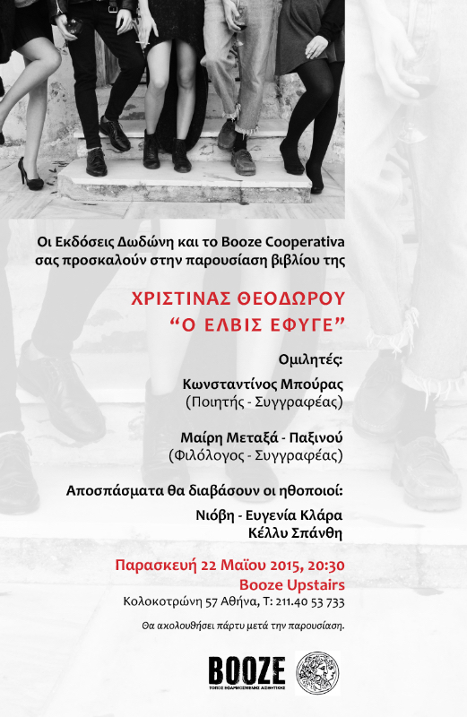 Οι Εκδόσεις Δωδώνη και το Booze Cooperativa παρουσιάζουν το βιβλίο της Χριστίνας Θεοδώρου, με τίτλο «Ο Έλβις έφυγε»