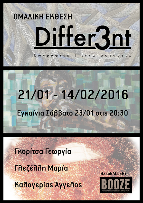 Η έκθεση Differ3nt αποτελεί τη κοινή παρουσίαση του έργου 3 νέων καλλιτεχνών. Τη βλέπουμε σαν μία συνάντηση στον ίδιο χώρο 3 ανθρώπων με διαφορετικές μεταξύ τους καλλιτεχνικές αποσκευές, διαφορετικά εικαστικά μέσα και λεξιλόγια.
