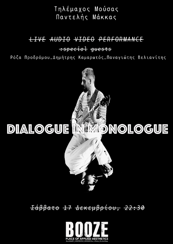Ο συνθέτης, πολυοργανίστας Τηλέμαχος Μούσας και ο εικαστικός, video artist Παντελής Μάκκας για μία και μόνο live audio video performance. Με επιροή το βίντεο του Παντελή Μάκκα “Mono Logue” (2011, https://vimeo.com/20464829) συνδιαλέγονται και αλληλοεπιδρουν ο καθένας από την δική του οπτική και δημιουργούν τον “Διάλογο ενός Μονόλογου".
