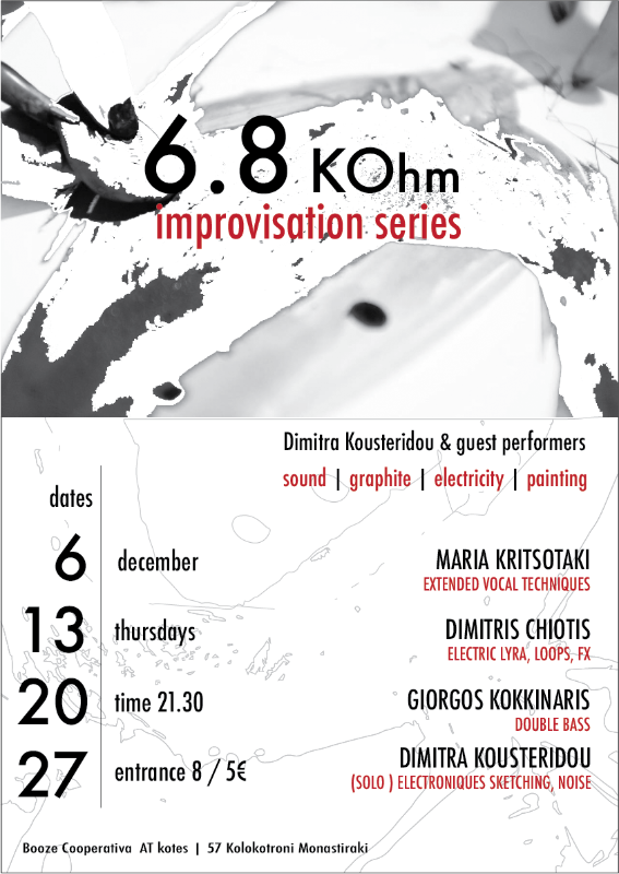 Στο πρώτο session του 6.8KOhm Improvisation series,η Δήμητρα Κουστερίδου (σκίτσο, electronics) και η Μαρία Κριτσωτάκη (αυτοσχεδιαστικά φωνητικά),που γνωρίστηκαν καλλιτεχνικά στην Ολλανδία,συναντιούνται ξανά σε έναν ελεύθερο ηχητικό διάλογο.Η δημιουργία του ντουέτου, εξερευνά τον ήχο μέσω του ελεύθερου αυτοσχεδιασμού, δοκιμάζοντας συχνότητες, υλικά και φωνή σκηνογραφικά, σε μια διερεύνηση της αλλοτρίωσης των αισθήσεων δημιουργώντας συναισθητικές εμπειρίες.