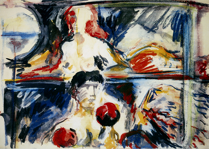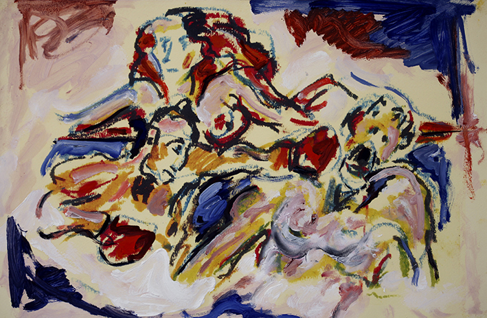Χρώματα. Κόκκινο αναζητά το άλλο κόκκινο, απαλό γαλάζιο συναντά το σκοτεινό μαβί. Σχήματα. Τρίγωνο, τετράγωνο, κύβος και κόλουρος κώνος συναντούν τον κύκλο και την σφαίρα εκεί όπου λάμπει στο μάγουλο σου το φως, κατεβαίνοντας στο σαγόνι και μετά στον λαιμό. Στα τρίσβαθα κρυμμένος ένας χορός και κανένας – ξαφνικά το χέρι χορεύει, το πινέλο χορεύει και κανένας δεν είναι να μας διδάξει, κανείς μας δεν ξέρει τι ο χορός. Κλείνω τα μάτια. Παρακαλώ να κοιμηθώ, να γίνω κανονικός. σοβαρός άνθρωπος, αλλά το ένα σχήμα ξυπνάει το άλλο σχήμα, ατέλειωτη αλυσίδα από χρώματα/σχήματα που κάποιος άλλος επιμένει να ζωγραφίζει χωρίς να με λυπηθεί.