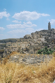 Πρωτεύουσα της ομώνυμης επαρχίας στο νομό της Basilicatα, στην νότια Ιταλία, είναι γνωστή από τους προϊστορικούς χρόνους. Η διαδρομή της Matera, στων αιώνων τα γυρίσματα, μένει εμβληματική. Η πανάρχαια ιστορία της, η χαρακτηριστική οικιστική της διάρθρωση, τα σπίτια - σπηλιές, τα αποκαλούμενα Sassi, η μοναδική, βιβλική φυσιογνωμία της, καθόρισαν παρελθόν και μέλλον μιας πόλης συμβόλου της ανθρώπινης αγωνίας αλλά και της εξέλιξης ενός απομονωμένου πολιτισμού.